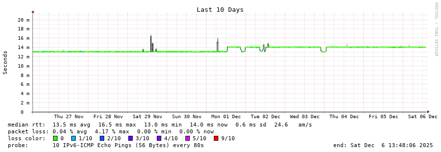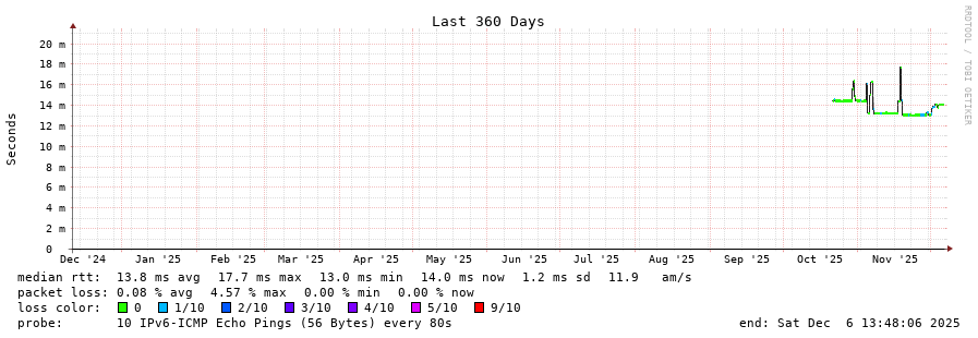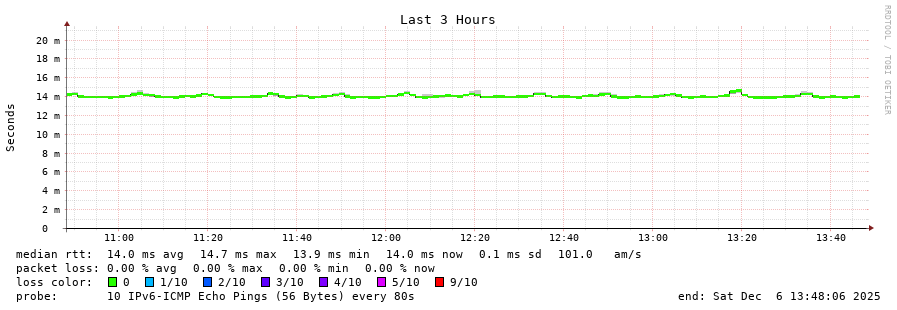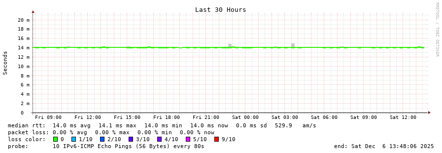 traceroute to 2001:b68:d::28 (2001:b68:d::28), 30 hops max, 80 byte packets - Generated at 2025-12-06 13:30:01