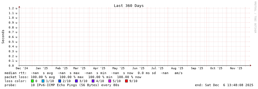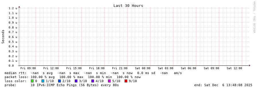 traceroute to fd69:226f:3a3c::2 (fd69:226f:3a3c::2), 30 hops max, 80 byte packets - Generated at 2025-12-06 13:45:01 3 > 4 > 5 > 6 > 7 > 8 > 9 > 10 > 11 > 12 > 13 > 14 > 15 > 16 > 17 > 18 > 19 > 20 > 21 > 22 > 23 > 24 > 25 > 26 > 27 > 28 > 29 > 30 >