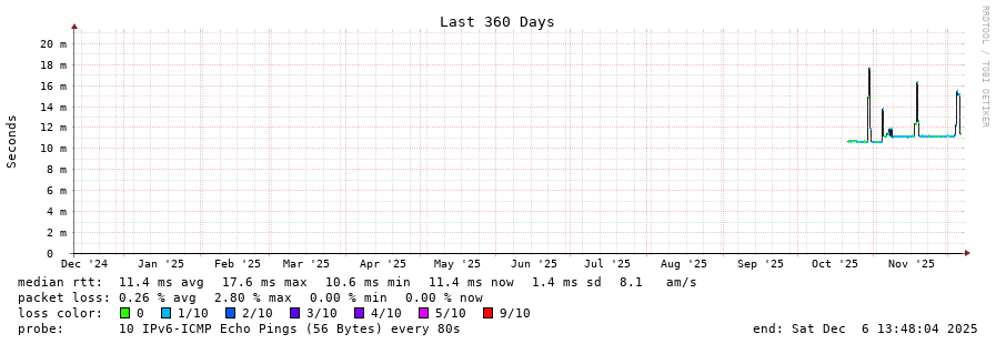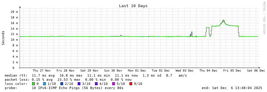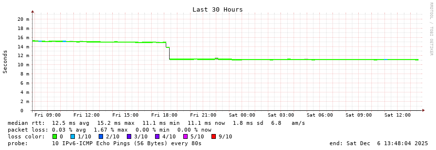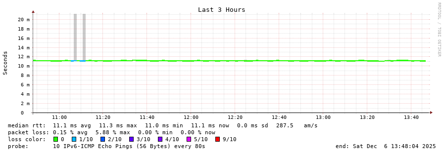 traceroute to 2a00:c30:bbbb:d::2 (2a00:c30:bbbb:d::2), 30 hops max, 80 byte packets - Generated at 2025-12-06 13:45:01