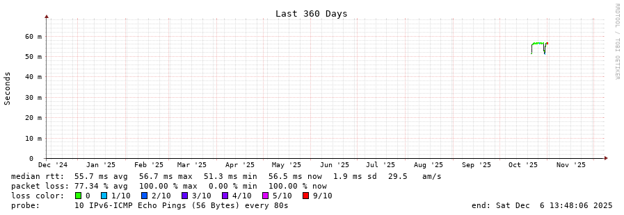 traceroute to 2a02:2f05:2113:7f00:220:4aff:fee0:220f (2a02:2f05:2113:7f00:220:4aff:fee0:220f), 30 hops max, 80 byte packets - Generated at 2025-12-06 13:30:01