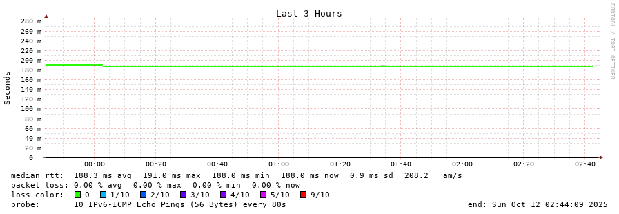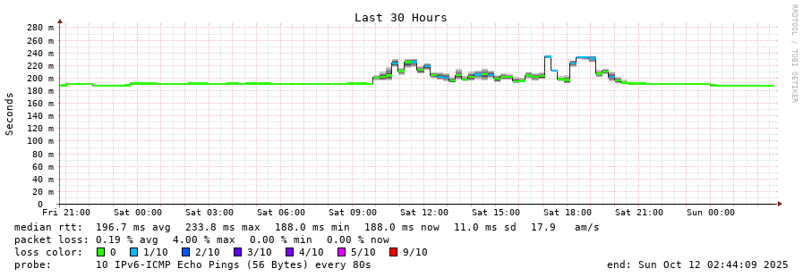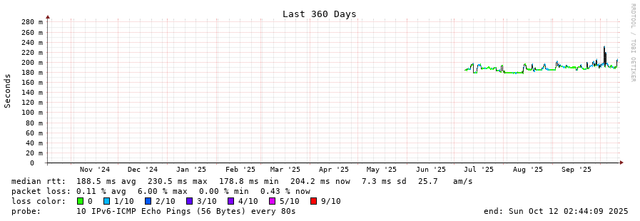 traceroute to 2604:2dc0:202:200::1f9 (2604:2dc0:202:200::1f9), 30 hops max, 80 byte packets - Generated at 2025-10-12 02:30:01