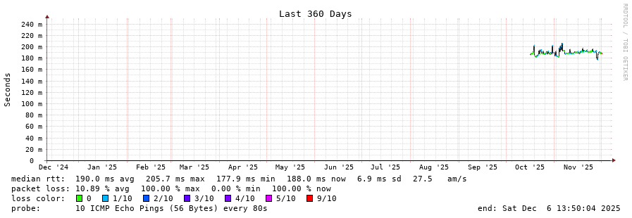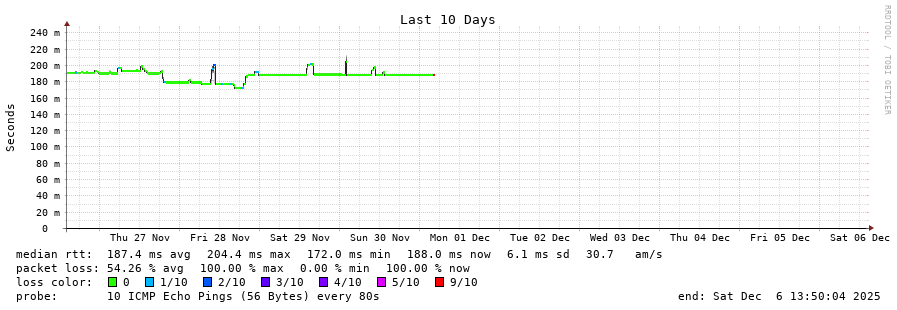 traceroute to 190.14.227.10 (190.14.227.10), 30 hops max, 60 byte packets - Generated at 2025-12-06 13:45:01 3 > ae7-0.rt.eq2.sof.bg.retn.net (87.245.231.188) [AS9002] 0.307ms !N0.404 ms!N
